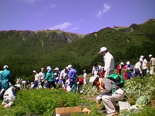 じやがいも掘り。 お父さん、お母さんも熱が入る。 今年は高原のジャガイモ掘りを企画しました。 掘ったジャガイモは必要なだけ、出荷価格で販売しました。 標高1500米のとりたては「しあわせ」の味です。 来年は範囲を広げて高原野菜を味わって貰います。 この企画へのご意見をお寄せ下さい。 |