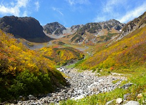 朝までしつこく雨が残っていましたが、 午前10時頃から急速に天気が回復。 周りを見渡すと、 やっぱり昨日の荒れ模様で標高の高いところの紅葉は あらかた飛ばされたみたいです。 それでも涸沢や槍沢の方を覗き込むと標高2200m以下の地域では まだダケカンバを中心に色づいた様子が見て取れました。 今日登って来た友人に写真を見せてもらうとまだまだけっこうきれいで、 特にナナカマドの紅葉は昨日の強風に耐えて、まだ残っている所が多いようです。