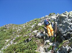 | そんな氷河時代の置き土産の巨岩の中をしばらく登っていくと、 今度は本当にやせた岩尾根の道へと変わっていきます。 1998年の地震で大きな被害を受けたところですが、今年の6月にハシゴが新設されたり、不安定な岩を除去するなどしてずいぶんと歩きやすくなりました。 とはいえ、長い道のりを歩いてきた最後の最後にこの急な登りはちょっと辛いかもしれません。 |