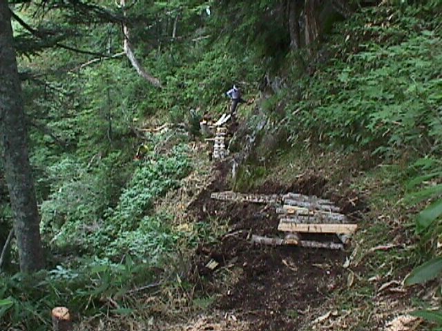 山麓の樹林帯には石段や木の階段を、またコース上部のハイ松帯には