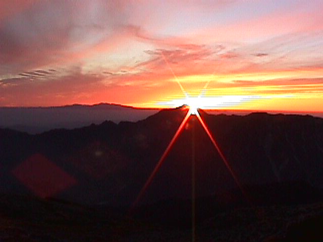 ちょうど笠ヶ岳の大笠と子笠の間の笠ヶ岳山荘のあるあたりに沈む夕陽です。
