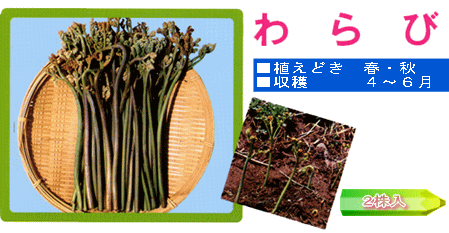| 1.ワラビやゼンマイ等と同じシダの仲間で、代表的な山菜の一つ。 |