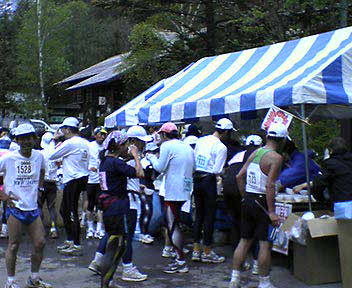 | 35キロ、稲子の湯のエイドステーション → 私はここで着替えと靴の履き替えをしました。 お汁粉を頂いて、さあ出発! |