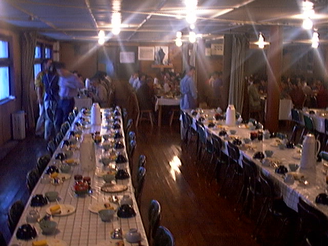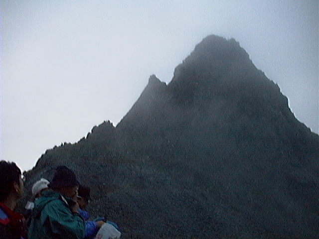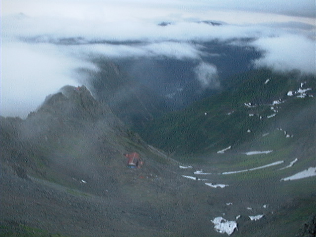山の姿 7/29 台風崩れの熱帯低気圧のおかげで昨日は一日しょぼしょぼと湿ったガスで時折弱い雨もふり登山者の方は濡れて来られお気の毒でした。 夜は静かでうっかり寝過ごしてしまい、4時30分過ぎに外に出てみると槍の穂先が雲の中に見えています。 槍の穂先と槍沢、朝の食堂の様子を送ります。