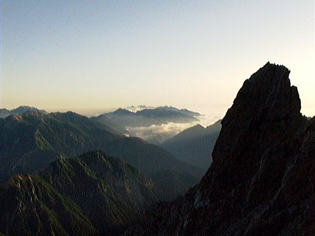 朝の小槍と裏銀座の山、遙かに鹿島槍、白馬の峰が見られます。