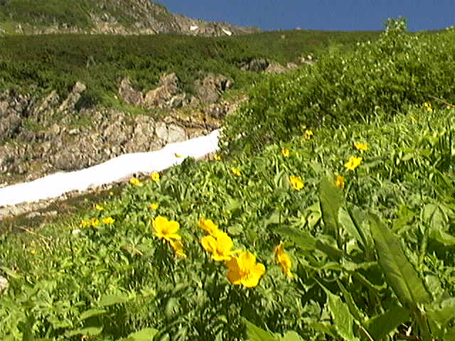 梅雨が明けると本格的な夏山シーズンを迎えます。今年は雪解けも早く、高山植物 の可憐な花々が7月初旬の今日、私たちの目を楽しませてくれています。 写真は、槍沢カールのシナノキンバイの群落。