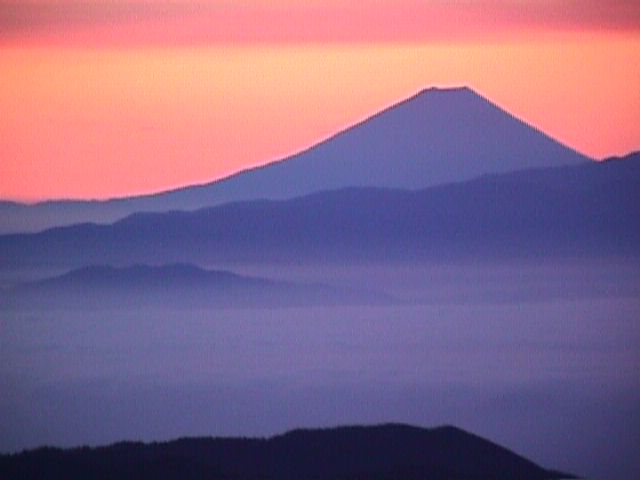 秋になりすばらしい日の出が見えるようになりました。 富士山も赤い雲に包まれて、すそ野の大分下まで見えるほど良い天気でした。 小屋の中からも、常念の上に出る日の出が見えるようになりました。