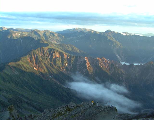 は多いものの展望は良く、朝日が双六、三俣、薬師といった山々にあたりさわやかな
