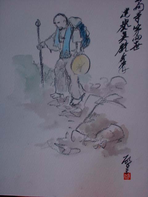の荻須御住職をモデルに、槍ケ岳に登る播隆師の似顔絵を描いていただきました。