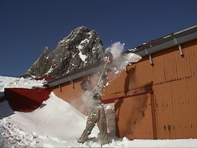 小屋の周りの雪をスコップで屋根に乗せ、日光によって解かした雪を