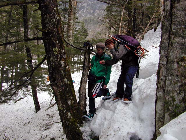連休を前に槍沢ロッヂの電話線の設置作業が進んでいます。 今年は、例年になく雪が多いため、作業は遅れ気味です。 雪の足をとられながらの作業なので、1日に1キロメートルくらいが やっとです。横尾から、槍沢まで、約4キロメートルに電話線を設置 するのに4日かかりそうです。