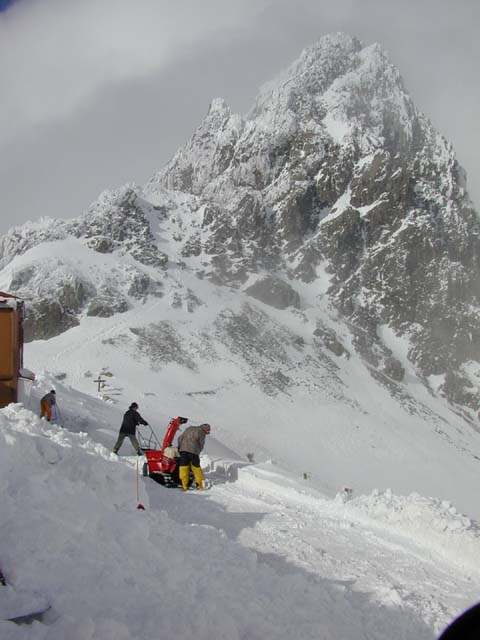 入山後、なかなか天候に恵まれず除雪も思うようにいきませんでしたが、 昨日からようやく、除雪機もフル稼動し始めました。 テント場には、岩氷がつきました。 飛騨の山も真っ白ですが、常念岳や、穂高も真っ白で、久久に春の山ら しい連休になりました。槍沢も、真っ白で、槍ケ岳の肩から、槍沢ロッヂ まで、一気に滑れそうな感じです。