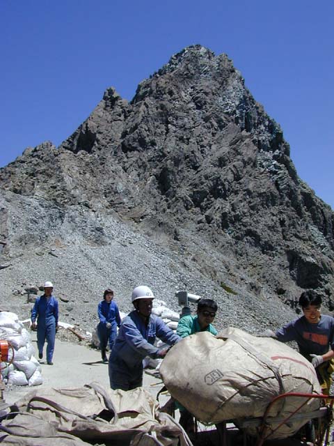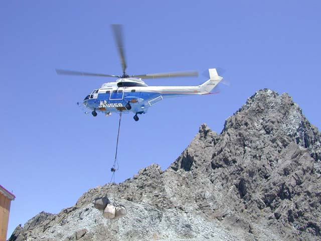 6月15日槍岳山荘の新トイレのし尿処理に使う通気性土壌の搬入を行いました。 一袋250キロのものを、大型ヘリコプターは一度に5袋運んできましたので、 荷揚げは2時間足らずで終わってしまいました。 いつもの小型ヘリコプターは、一度に2袋づつしか運べませんので、大変な違いです。 スタッフも、久々の好天下、大張きりで、あっという間にヘリポートから小屋前まで、 運んでしまいました。