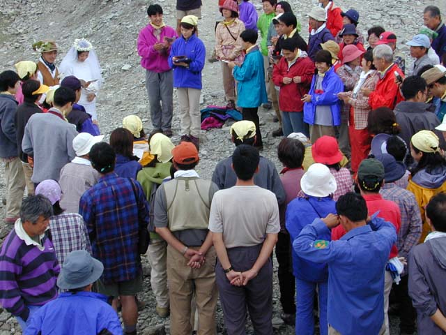 本日千葉県からお出かけの井出さんが、槍ヶ岳で結婚宣言をされました。 3年前折立から、槍ヶ岳まで縦走され3年前の昨日(8月18日)槍につかれたそうです。 1年間の遠距離恋愛を乗り越え、本日30人の仲間や、居合わせた登山者に祝福されて 結婚されました。