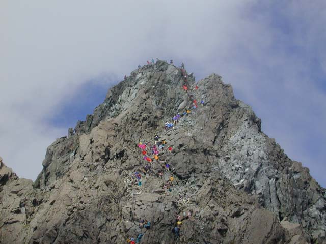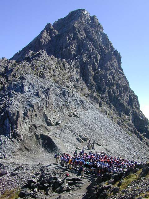 8月20日から24日にかけて、槍、笠、双六山系で全国高校登山大会が、開かれています。 22日は、9時にA隊約280名が槍平より槍の肩に到着し、11時までに双六に向け出発、 続いて11時にB隊約280名が、双六より到着、13時までに槍平に向け出発、 そして最後にC隊約150名が、16時に到着,宿泊する予定です。写真は、A隊到着集合時です。 長野県からは、A隊に松本県ヶ丘高校、B隊に飯田風越高校、C隊に松本蟻ヶ崎高校が、参加しています。