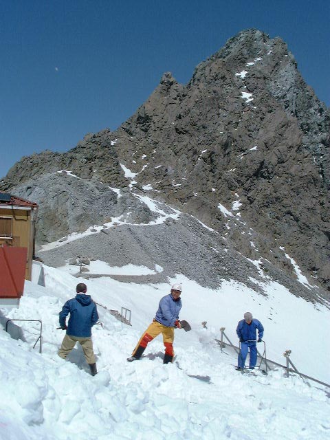 北アルプスの槍岳山荘が20日に小屋開けを行いました。 今年の冬は寒さが厳しかったものの、4月に入ってからの暖かさのおかげで雪は例年より 少なく比較的楽な小屋開けとなりました。 それでも小屋の内部は霜や氷がびっしりと張りつき、さながら冷凍庫の中のようです。 4/27の上高地開山祭までの一週間で営業準備を整え、ゴールデンウィーク期間中に押し 寄せる登山者をお迎えします。