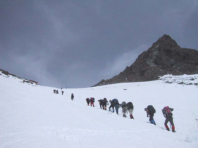 GWにはいり、槍ケ岳は多くの登山者やスキーヤーで賑わっています。 槍ケ岳頂上(写真右側)へは鎖場や梯子があるため渋滞が起こるほどです。 写真では傾斜がゆるく見えますが、ここは槍ケ岳山荘の直下で傾斜はきつく 3000m近い標高でr空気も薄いため、登山者はゆっくり一歩ずつ登って行きます。 29日は天気がよく風も穏やかで、最高の登山日和となりました。