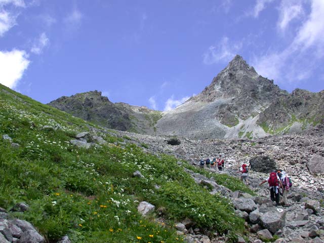 今年の海の日の賑わいは、天候にも恵まれ 山の日とも言えるような賑わいがどこの山でもあったように思いますが、 ここ槍ヶ岳にも、大勢の方がいらっしゃいました。 今年は、早くから梅雨が明けたこともあり、高山植物の開花も早く、 早くも満開といった風情です。
