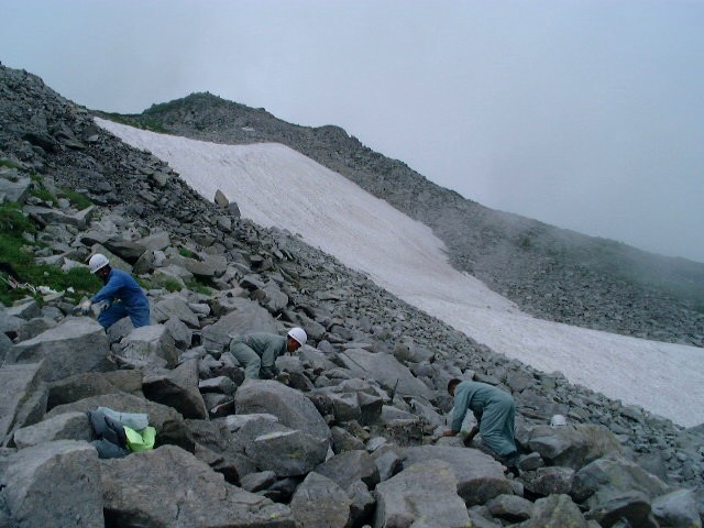 現場付近は氷河地形の広がる地域で直径1mを越す岩がゴロゴロと転がる作業の困