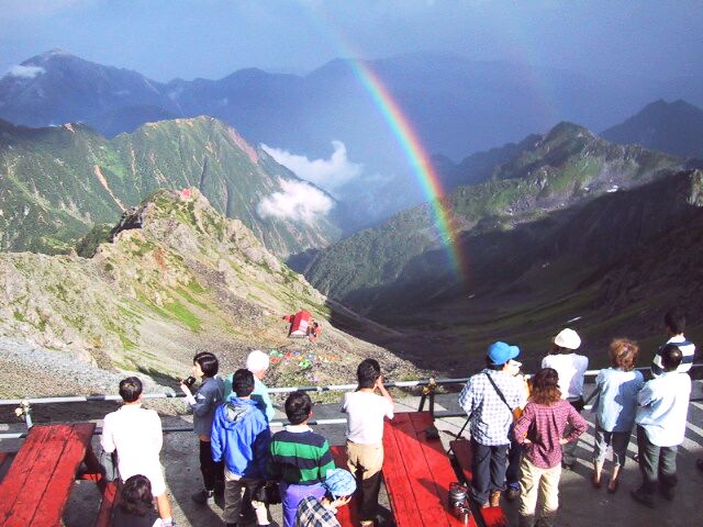 今日の虹は殺生ヒュッテの辺りにできたため、登山者にとって普段見ることのできな
