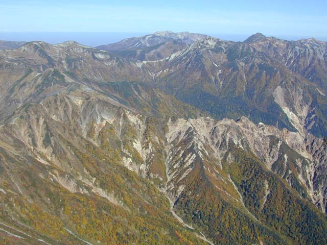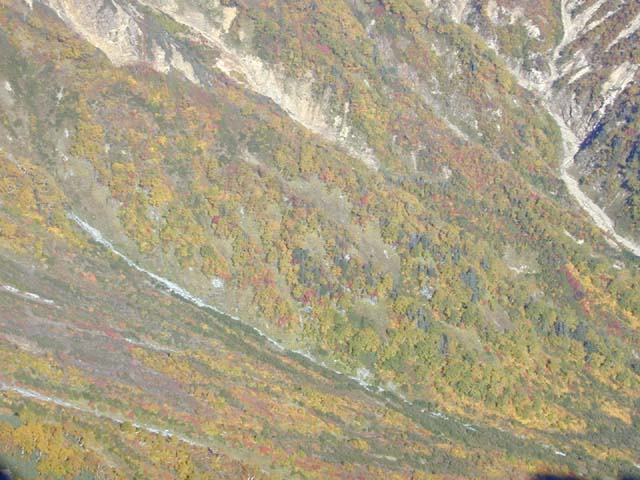 朝、荷揚のヘリコプターを待っていると、眼下に千丈沢が、美しく輝いていました。 錦秋というに相応しい綾織のような秋が、広がっていました。 よく見ると、はるかに、三俣蓮華岳の稜線にも同じような秋の景色が、広がっています。 静かな秋の山旅を、楽しむのなら稜線歩きも良いかもしれません。 穂苅康治
