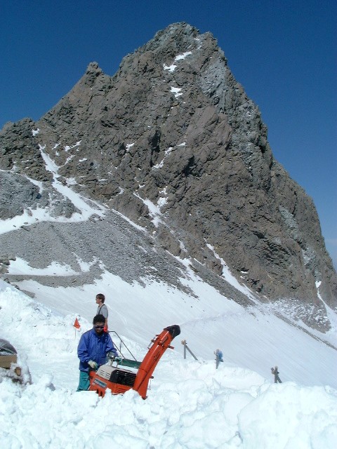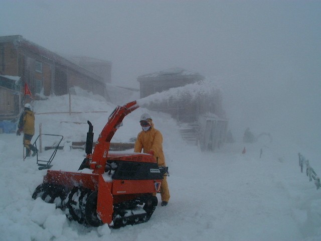 槍沢側からの20mを越す暴風に除雪機で飛ばした雪も押し戻されるような始末・・・
