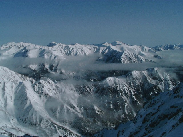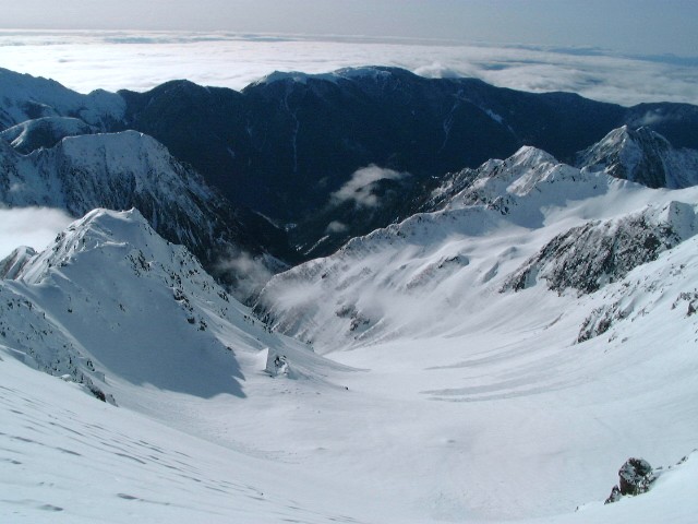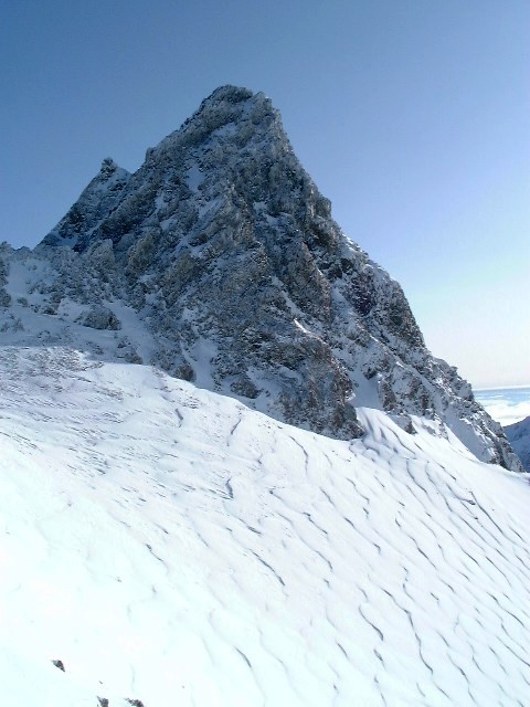 猛吹雪から一夜明け、新雪の槍ケ岳 昨日(21日)の猛吹雪の中での除雪作業から一転して、22日はキレイに晴れ上がりました。 新雪をまとった槍の穂先のたもとには昨夜の強風を物語る風紋が残り、 裏銀座の山々や槍沢の氷食谷は真っ白な新雪で覆われました。 山小屋に何年いてもこういう光景に出会えると本当に嬉しいもので、今朝は朝食前から 外に出て写真を撮りまくっていました。