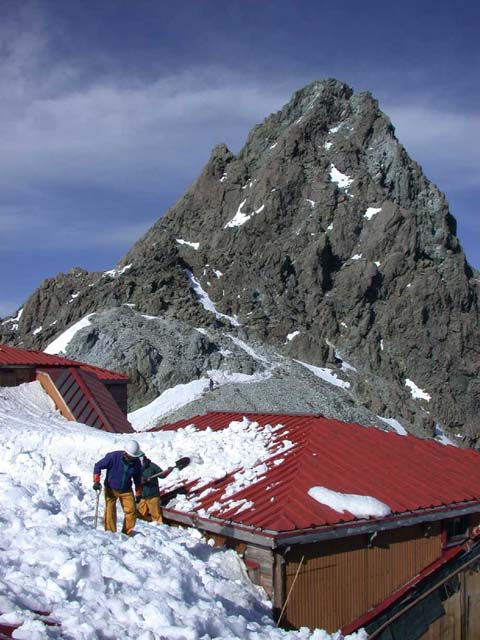 槍岳山荘の慈恵医大の診療所には、昔から「水の一滴血の一滴」と書かれています。 槍岳山荘の水の99パーセントは、天水でまかなっているので、水の大事さを診療所 スタッフに語り継ぐために先輩が残されたものです。 下界で雨が降ってもここではほとんど雪になってしまうこの時期、 スタッフの仕事で,水の確保は最重要課題のひとつです。 毎日、手の空いたスタッフが,屋根に雪を上げています。 穂苅康治