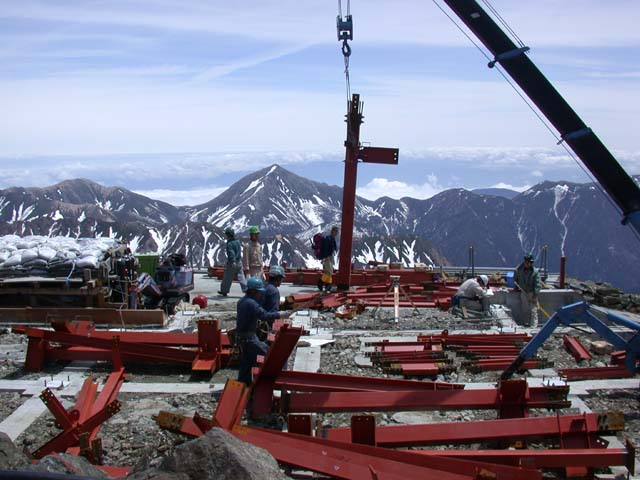 五月の連休も終わり,9日から槍岳山荘の改築工事が再開しました。 7日から天気待ちをしていた工務店のスタッフもようやく晴れ間を縫って 山荘に上がり、鉄骨関係の資材も無事荷揚げができました。 大型と小型のヘリコプター2機での荷上げで、重い鉄骨を移動する 現地の荷受けが大変で大忙しの1日でした。 工事の始めには、工務店の社長や、鳶の親方と安全祈願をいたしました。 無事、工事が終わることを祈っております。 穂苅康治