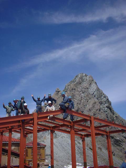 5月9日、ヘリの荷揚げから鉄骨組み上げ作業が始まりました。4日目の12日に新しい 棟の全体像が見えてきました。夕方、全従業員、職人が見守る中、最後の1本の鉄骨 が無事収まったときは、万歳三唱で成功を喜びあいました。 写真=建磨組、小松工業のみなさん