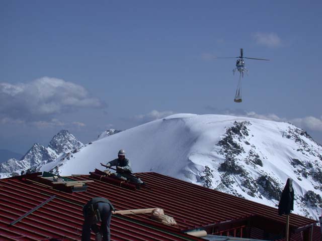 この日は、2階の床材を25トン以上ヘリコプターで荷揚をしながら,床を張り,屋