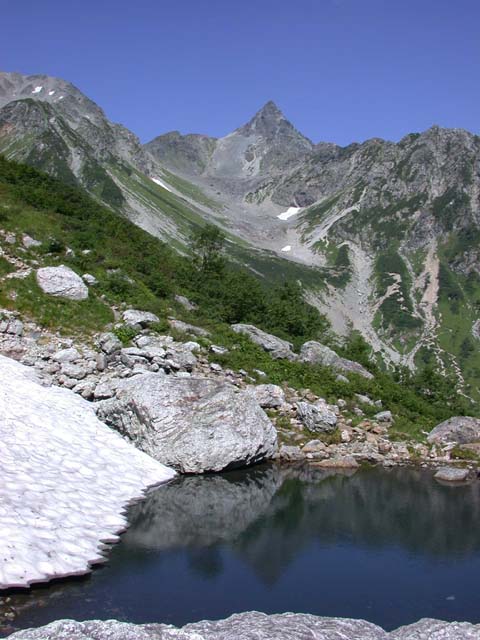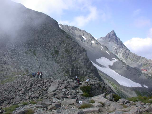れませんでした。帰りがけに,中岳まで来るとガスが少し開いて、登山者が槍を眺めているの