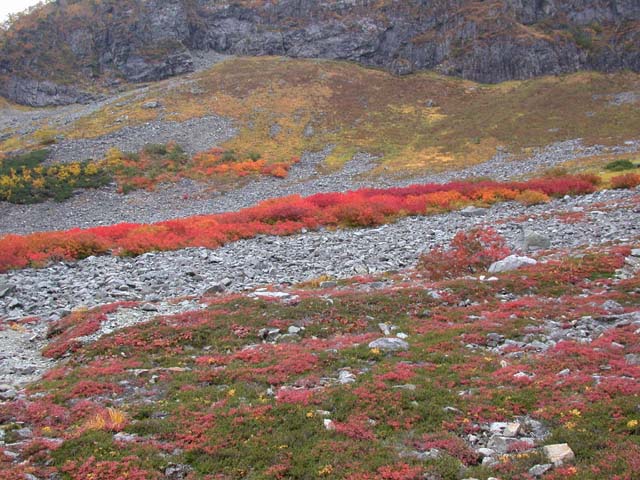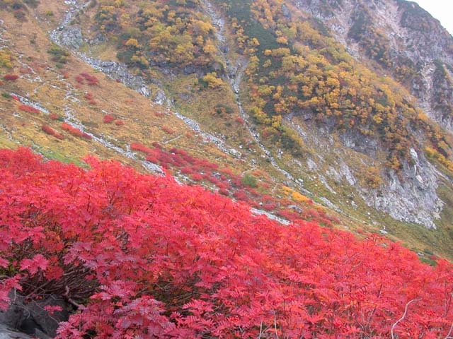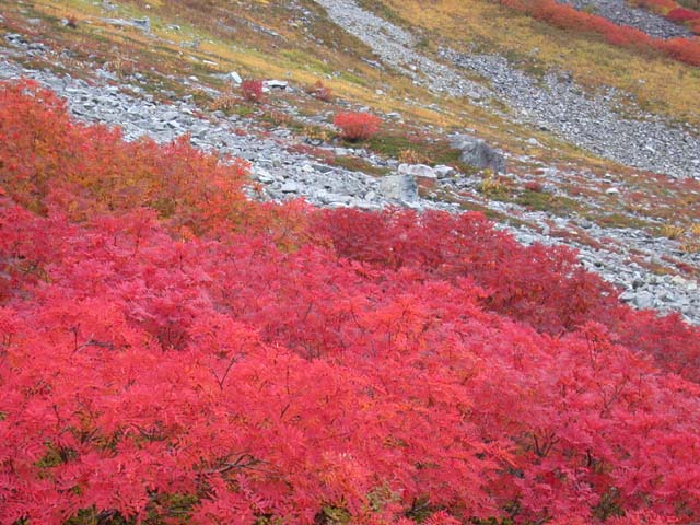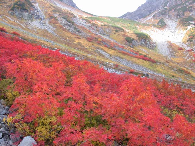槍沢の紅葉は、天狗原から、ロッヂの下まで、一気に始まりました。