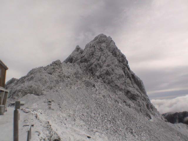 槍が岳に昨夜来の雪で新雪が薄っすらとつきましたが、日の出とともに消えてしまい