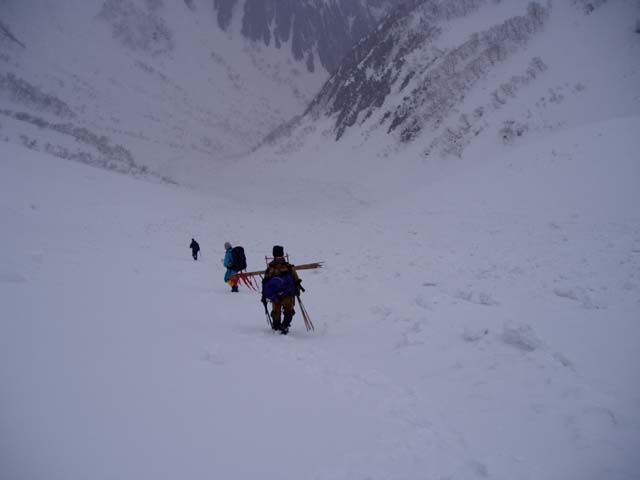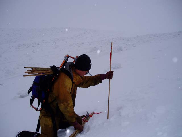 候の制約があるので、吹雪の中ポールたてを行いました。磁石を見ながら、下山しつ