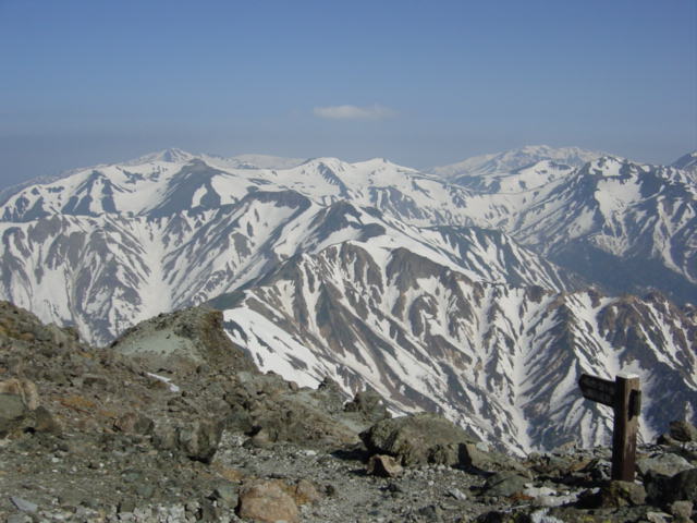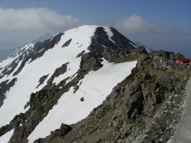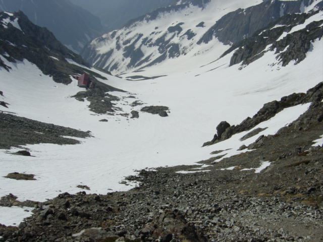 今日は天気がとても良いのですが風が冷たく朝の気温はなんと氷点下5度。槍沢の雪 渓も早朝はアイゼンがギュギュ鳴ります。写真は6月3日の槍沢と大喰岳、東鎌と常 念岳、三俣蓮華岳方面の様子です。ご覧の様に雪渓はまだまだ残雪多く登山の折には 充分な装備でお越し下さい。