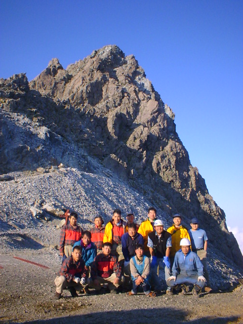 岐阜県警山岳救助隊の方が槍ヶ岳に夏山前の訓練に来ました。梅雨の最中でしたが天気に恵ま れ、順調に訓練が進められたようです。真剣に救助訓練をする姿に山に対する意気込みを感じ ました。全員が登頂後、山荘の従業員と一緒に記念撮影をしました。まもなく夏山シーズンが 始まり、たくさんの登山者で山も賑わいますが、救助隊のお世話になることなく、無事なシー ズンになることを祈ります。