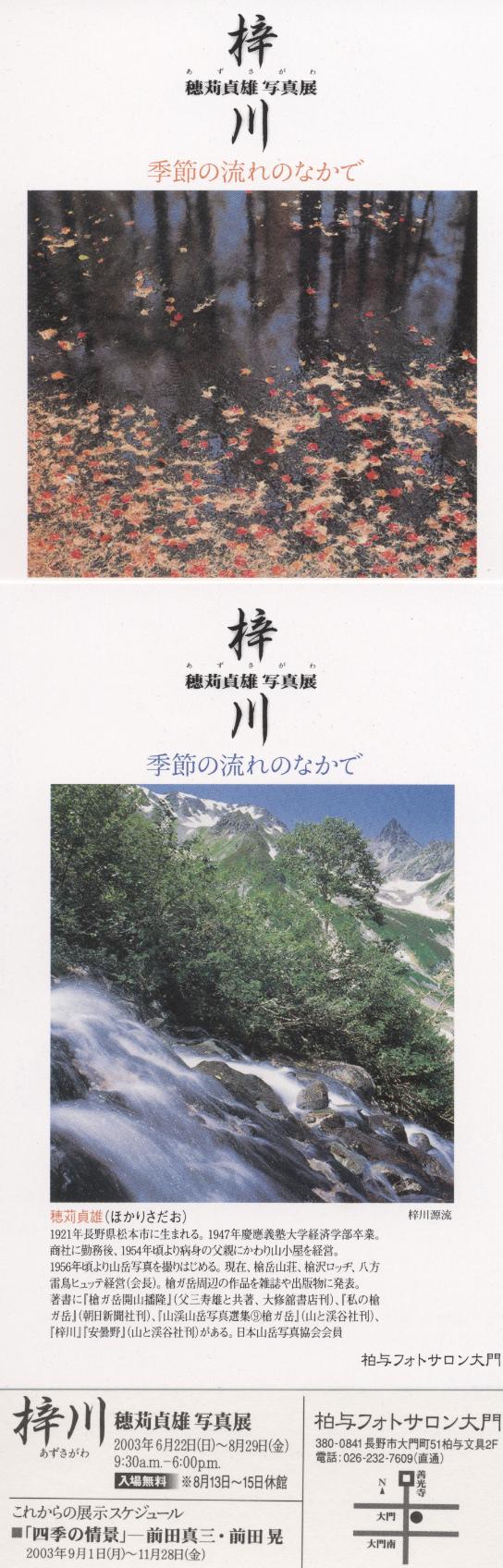 6月22日より、8月29日まで、長野市大門の柏与フォトサロンにおいて、穂苅貞雄の 写真展が開催されています。 梓川源流の槍ケ岳から、上高地、安曇野にかけての四季の移り変わりを捉えた写真 が、展示されています。 山の行き帰り或は長野の善光寺にお出かけの折に、お立ち寄り戴ければと思います。 穂苅康治