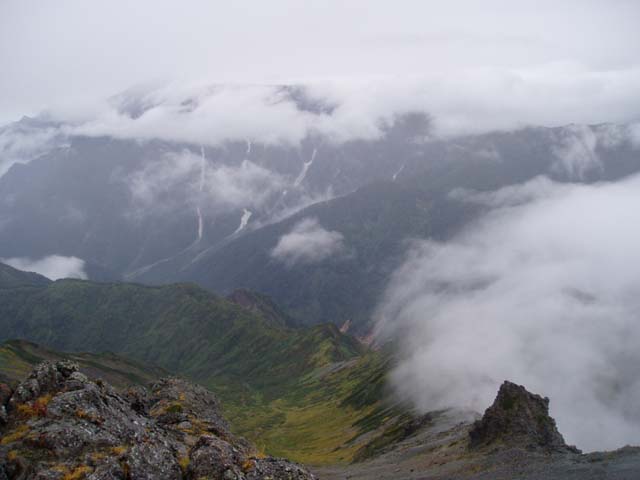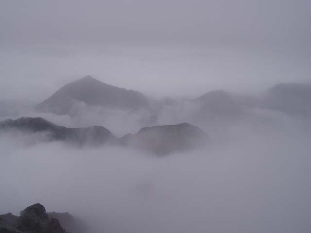 昨日より台風が近づきつつあるとの気象予報で、山は、連休にもかかわらず大変静か です。 今日は予報と違って風は穏やかでしたが、終日驟雨でした。 16時過ぎに突然視界が開け、穂先や笠が岳常念岳等が墨絵のように見えるようになり ました。登ってこられた数少ない登山者の皆さんは、この突然の贈り物に大変興奮さ れて一心に記念撮影をされていました。 雨に煙る常念岳、笠が岳を送ります。 槍ヶ岳山荘 穂苅康治