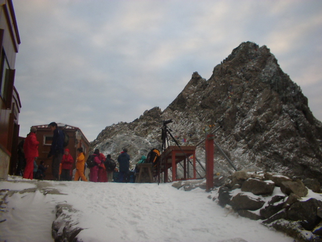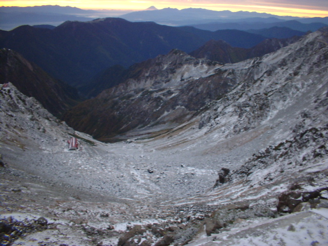 遅い秋が来たかと思ったら、はやくも山には冬の足音が聞こえてきました。 先週初雪が降ったと思ったら、また、少し雪が降り、登山者を驚かせました。 朝の槍沢と山荘前の写真を送りますが、前回同様朝日とともに消えていっています。 吹き溜まりや、北斜面には暫く残るかもしれませんが、登山道の通行には支障は無い ようです。 撮影は中島研です。 槍ヶ岳山荘 穂苅康治