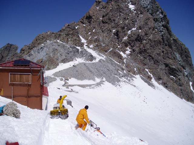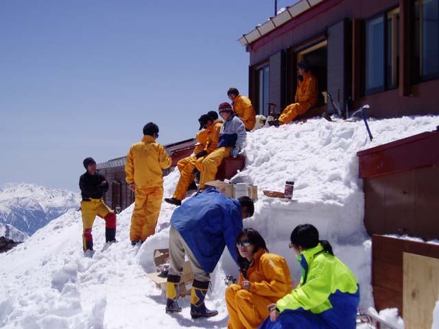 昨日、槍沢ロッヂのスタッフは、悪天にもかかわらず東邦航空のご協力で、入山でき ましたが、槍ケ岳山荘のスタッフは、強風とガスのために登れませんでした。今日 は、風は結構強めでも視界は良好で暖かくまずまずの入山日和でした。 雪は例年に比べかなり少なめです。 小屋開けも順調にいき、本館二階、玄関、南館の一部等開けることができました。 作業風景、お休み風景、槍沢の様子を送ります。 槍ヶ岳山荘 穂苅康治