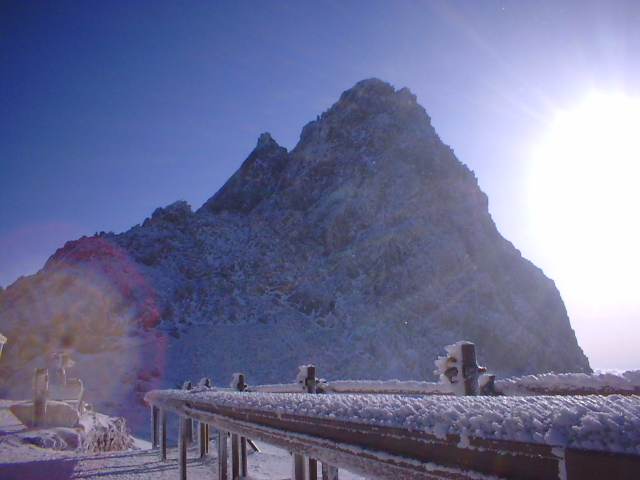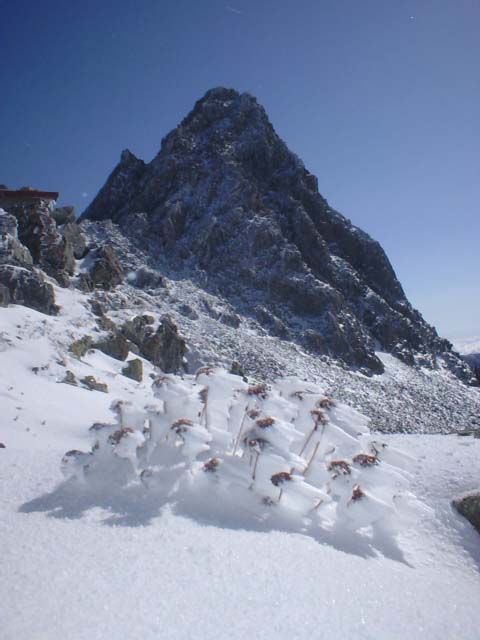 上空の寒気の影響で、槍ヶ岳では昨夜、雪(あられ?)となりました。