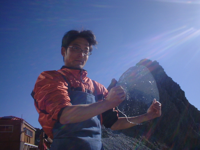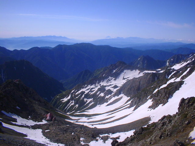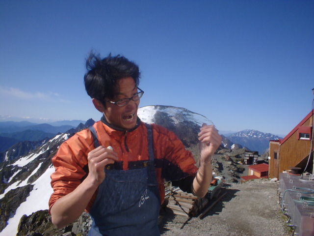 今朝は放射冷却の影響で気温が氷点下近くまで下がり、水のタンクの上には氷が張り ました。 北の高気圧におおわれて、湿度は低いので、遠くの富士山や日光の山々まではっきり と見えています。 松本、長野、上田の町も良く見えてます。 日の出とともに気温はどんどん上がり、今日も暑くなりそうです。 青空がとてもきれいです。 槍ヶ岳山荘 山口信吉