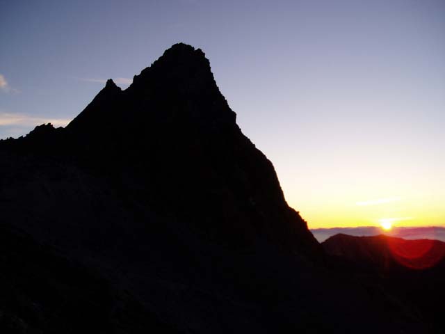 台風10号は、北アルプスには大して雨も降らさず、ただ、長い間営業妨害 だけしてくれてさっていきました。台風には、稜線の山小屋に、給水車の役割 もあるので、残念でした。 台風一過の久々の快晴にカメラを取り出して、朝日を捕らえてみました。 台風のバックファイアの南風が強く、カメラが飛ばされそうでしたが、 富士山の裾野まで見えて、登山者の皆さんは、大喜びでした。 穂苅康治