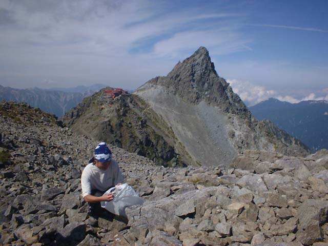 ごみ拾い遠足 南岳、双六、天狗原等行き先は、まちまちですが、ゴミ袋を持って出かけてもらいます。 今日は、久々に晴れたのですが、午前中はヘリコプターの荷揚げがあり、 忙しく、午後から近所の大喰岳に出かけてもらいました。 槍ケ岳山荘 穂苅康治