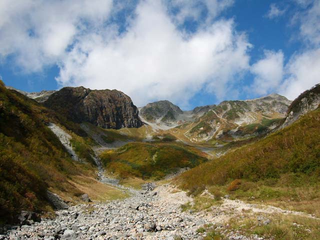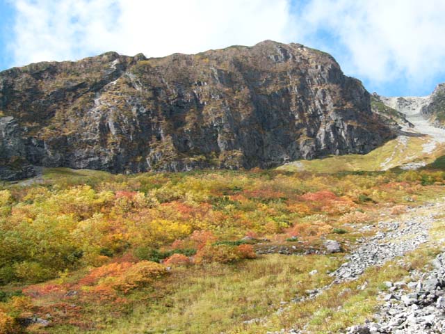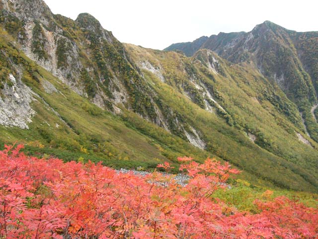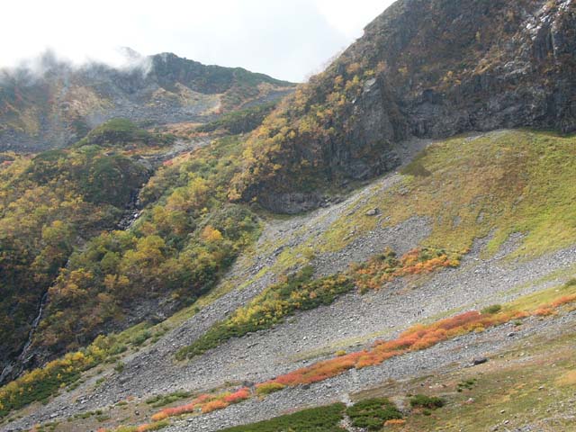 お天気が安定しない日が続いています。 天気予報がはかばかしくなくとも、晴れ間には、結構見れる絵がとれます。 むしろ、変化のある状況が、思いがけない「出会いの一瞬」を与えてくれることがあ ります。 今日送る絵は、必ずしも感動的ではありません。 最近の槍沢の紅葉の進み具合の参考にしていただければとおもいます。 槍ケ岳山荘 穂苅康治