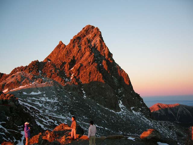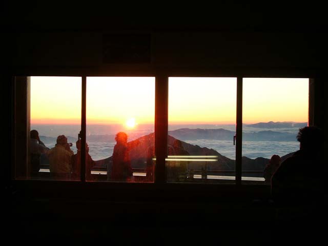 玄関ホールからの日の出と、夕日に遊ぶ登山者の写真を送ります。