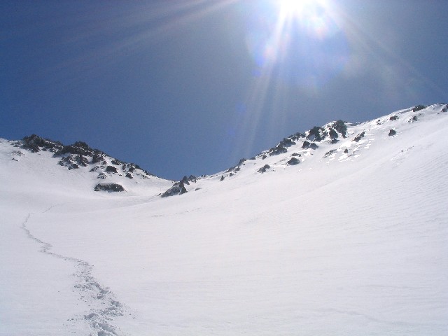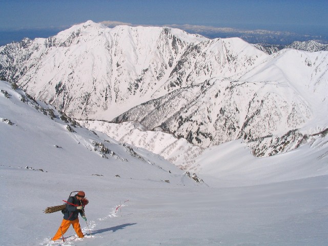 好天時にはどこを登っても楽しい雪の沢筋ですが、いったんガスられると小屋の従業員で