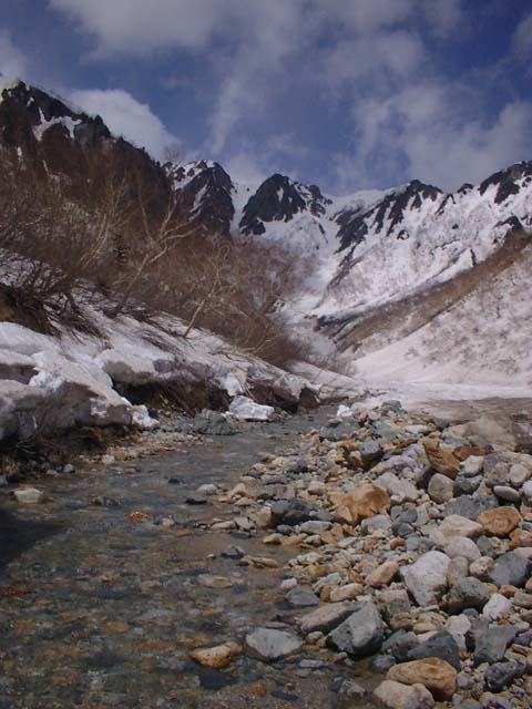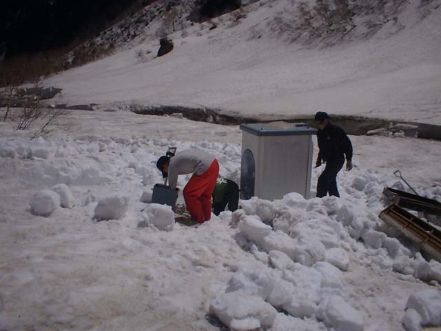 ようやく雪が少なくなってきた所、テント場のトイレを設置いたしました。連休中テ ント場をご利用されていた方には、大変不自由をおかけました。ゴールデンウィーク も終わり人出も少なくなりました。まだまだ春山も楽しめますのでぜひ槍ヶ岳にお越 し下さい。 撮影 大山 昇