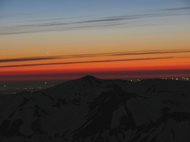 さらに日没後には黒部五郎岳の奥には残照の空の下、北陸地方の街灯りや
